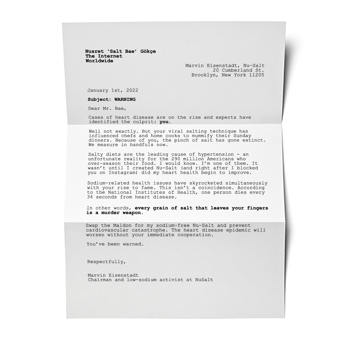 As an act of kindness, the CEO of Nu-Salt gave Salt Bae ample warning. Failure to act could result in catastrophe – or even a murder charge.
